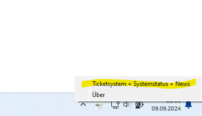 Wenn Sie mit einem Rechtsklick darauf klicken, dann haben Sie dort die Möglichkeit auf unser Supportportal zu gehen und ein Ticket zu eröffnen bzw. sich über Ihren Ticketstatus und die neusten Änderungen und Störungen zu informieren. Es öffnet sich dazu ein Link in einem Browser.